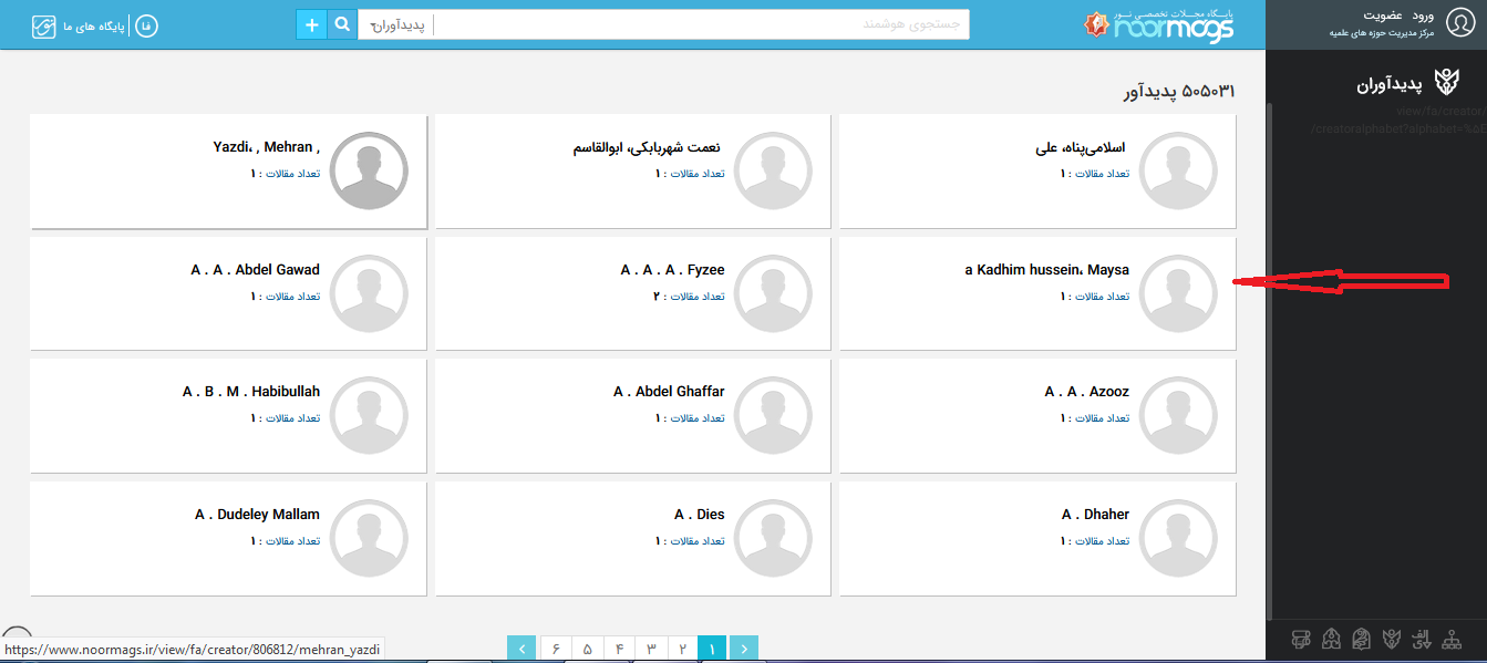 همچنین امکان مشاهده مجلات براساس نظم موضوعی یا الفبایی، مشاهده مقالات یک فرد خاص، یا فهرست مجلات براساس رتبه علمی(علمی پژوهشی یا علمی ترویجی) وجود دارد.(شکل6). با کلیک بر روی هر یک از منوهای موجود در کادر سیاه سمت راست صفحه که در شکل 6 با علامت فلش مشخص شده است، می توانید به هر یک از موارد بالا دست یابید.
