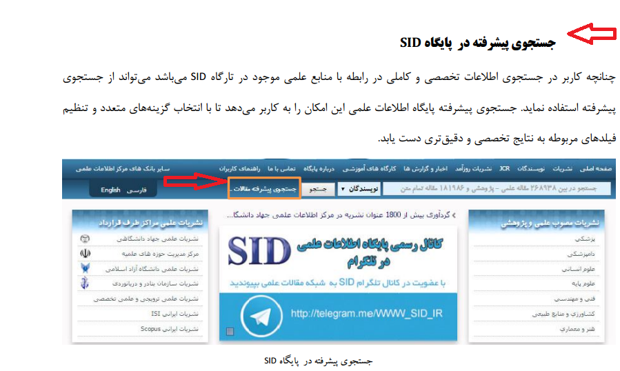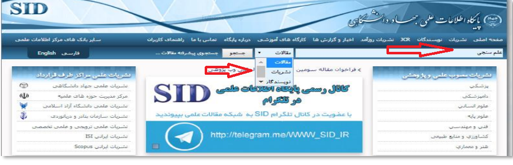 بعد از ورود به لینک بالا، شکل شماره 1 برای شما نمایش داده می شود. برای جستجوی ساده می توانید از کادر جستجویی که با فلش قرمز در شکل 1 نمایش داده شده است استفاده کنید. در این بخش می توانید براساس اطلاعات "مقالات"، "نشریات" یا "نویسندگان" جستجو کنید.