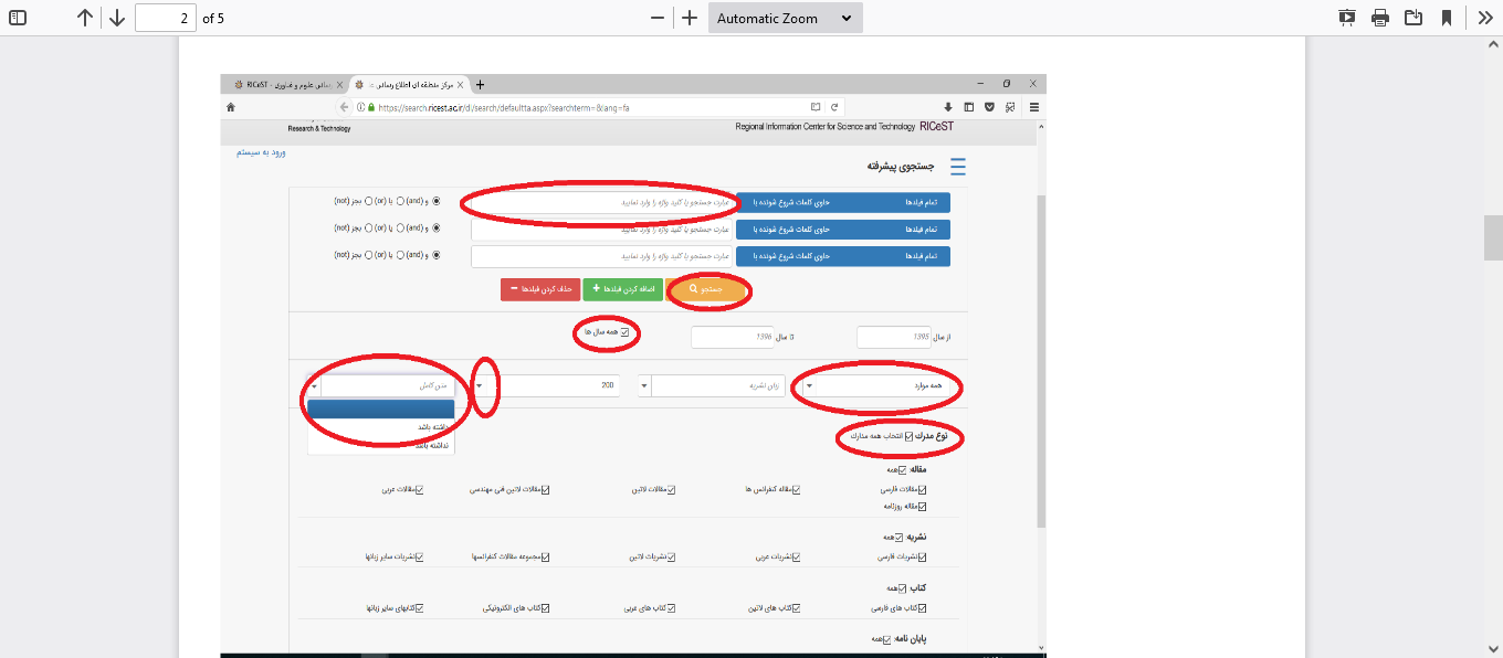 - فیلد جستجو را با کلمات کلیدی مناسب پر نمائید .از کشوی فیلد متن کامل عبارت داشته باشد، از کشوی مقابل فیلد تعداد مدرک در یک صفحه، تعداد مقالاتی را که در یک صفحه به شما نشان داده خواهد شد، از کشوی همه موارد می توانید نوع نشریه (علمی ترویجی، علمی پژوهشی، فاقد درجه علمی) را انتخاب کنید. به صورت پیش فرض از قسمت نوع مدرک تمامی مدارک انتخاب شده اند که می توانید آن را به همان صورت نگه دارید و یا از بین آنها مدرک مورد نظر خود را انتخاب کنید. همچنین می توانید سال مقالات مورد نظر را در فیلد سال تعیین نمائید و سپس بر روی جستجو کلیک نمائید (مطابق شکل زیر).