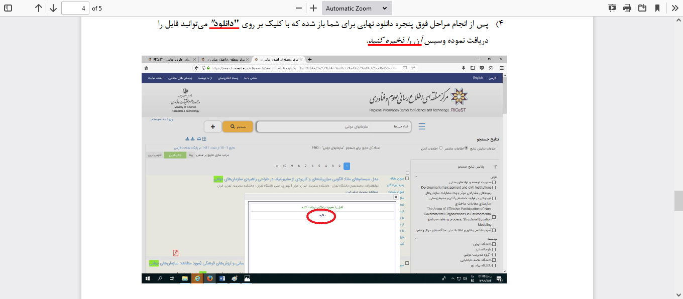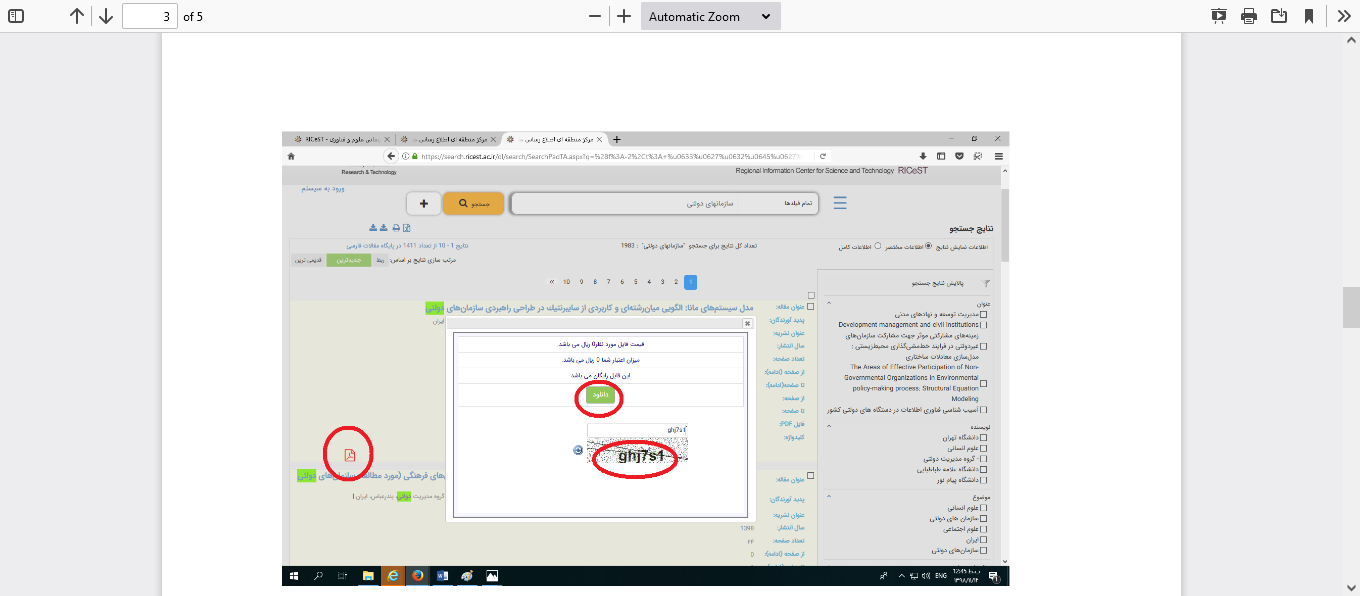 - پس از وارد نمودن کلمات کلیدی و انجام جستجو، نتایج جستجو در صفحه بعد آورده می شود که برای ملاحظه متن کامل مقاله ابتدا بر روی فرمت PDFکه در پائین هر مقاله نمایش داده شده است کلیک کنید و سپس پنجره دانلود فایل آورده می شود، کد امنیتی نمایش داده شده را در فیلد بالای آن تایپ کنید و سپس بر روی کلمه "دانلود"کلیک نمائید.