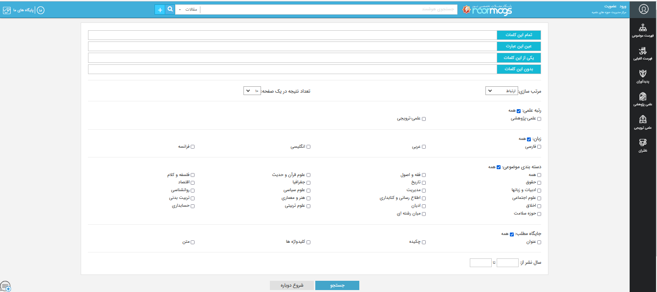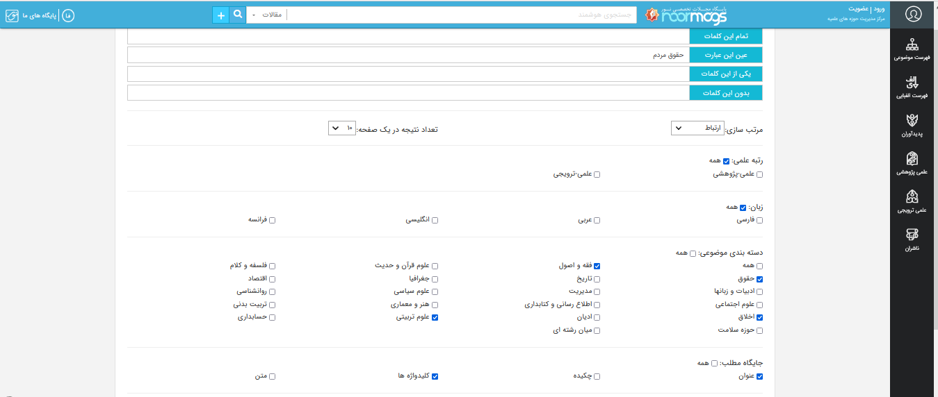 همانطور که در شکل شماره 3 نیز قابل مشاهده است، در این صفحه شما می توانید جستجوی خود را دقیق تر کنید و براساس رتبه علمی مجله، موضوع مجله، تاریخ نشر اثر، زبان اثر و اینکه عبارت مورد نظر شما در کدام بخش های یک منبع (عنوان، چکیده، کلیدواژه، متن) جستجو شود، می توانید جستجوی دقیق تری داشته باشید. توجه داشته باشید به صورت پیش فرض هیچ یک از آیتم های موجود در در این صفحه انتخاب نشده است (شکل3) و شما می توانید از هر گروه یک مورد یا همه یا برخی از موارد را تیک بزنید. (مثال شکل4)