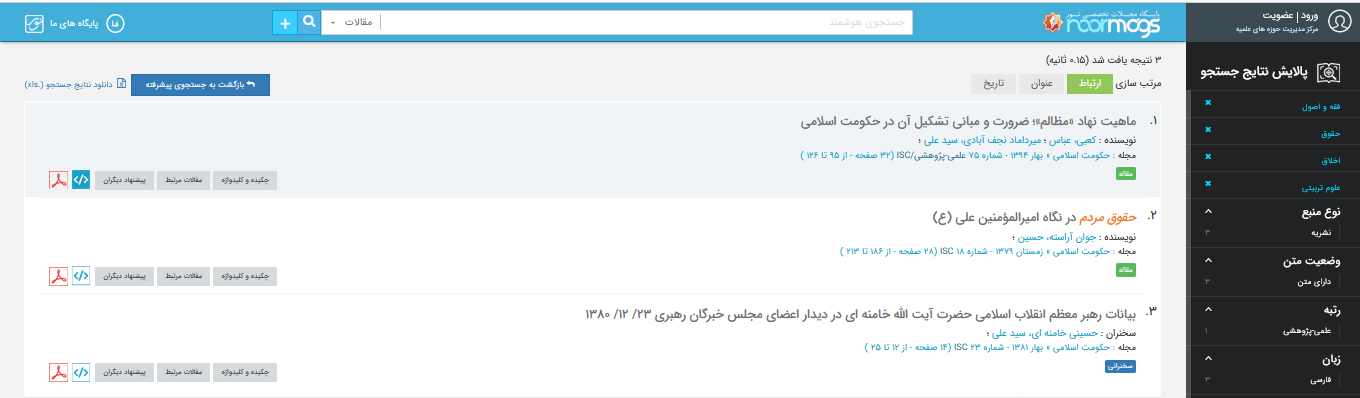 بعد از اینکه آیتم های مورد جستجوی خود را مشخص کردید، روی گزینه جستجو کلیک کنید تا مقالاتی که مرتبط با عبارت مورد جستجوی شما در پایگاه وجود دارد، برای شما نمایش داده شود. (شکل5).