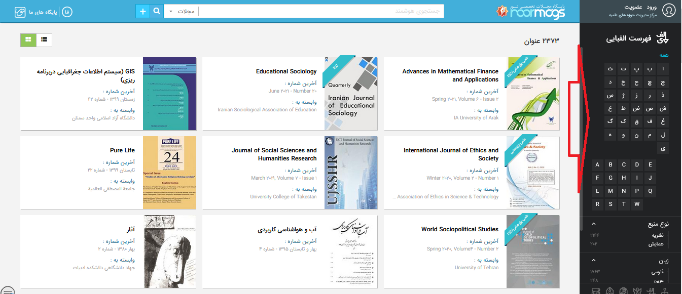 شکل8-دسترسی به مجلات براساس حروف الفبا
