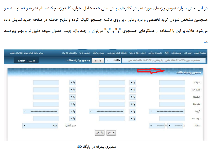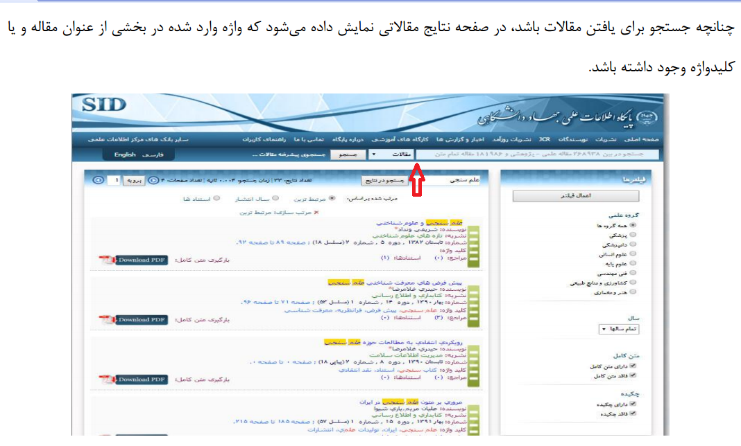 بعد از ورود به لینک بالا، شکل شماره 1 برای شما نمایش داده می شود. برای جستجوی ساده می توانید از کادر جستجویی که با فلش قرمز در شکل 1 نمایش داده شده است استفاده کنید. در این بخش می توانید براساس اطلاعات "مقالات"، "نشریات" یا "نویسندگان" جستجو کنید.