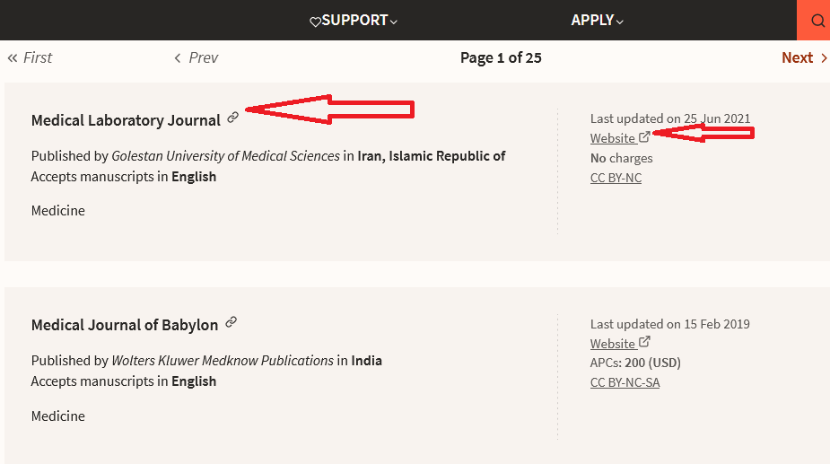 در شکل زیر، فهرست نشریاتی که در عنوان آن هاکلیدواژه medical وجود دارد، قابل مشاهده است، با کلیک روی عبارت website یا عنوان مجله که با فلش قرمز در شکل زیر نمایش داده شده است، می توانید به وبگاه مجله دسترسی پیدا کنید یا اطلاعات بیشتری در مورد این مجله بدست بیاورید و نیز امکان مشاهده و دانلود مقالات این مجله هم فراهم خواهد بود.